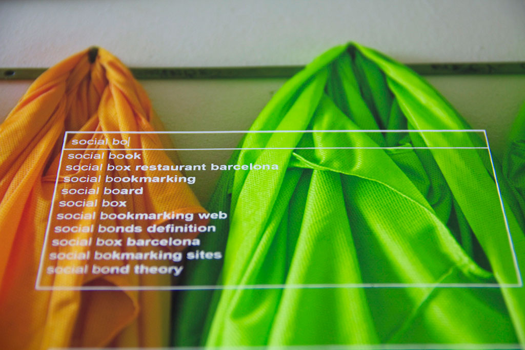 In "social bo|" I let the algorithms of an internet searcher the task of making sense of a photo about belongingness to a collective. I then silkscreen on the picture the results found by the searcher when typing social bo|.
