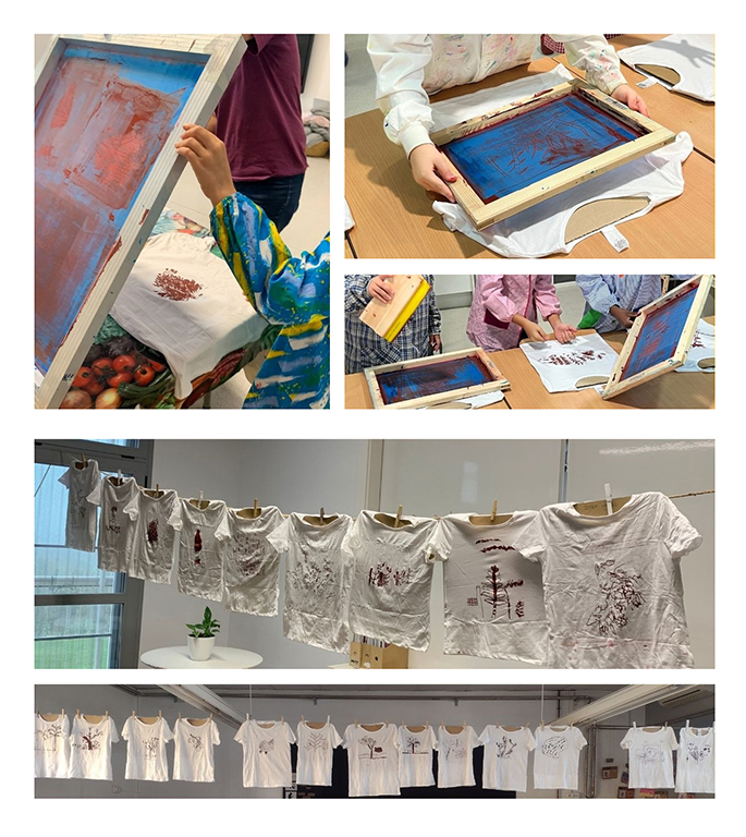 Research and mediation project in which I worked with women from Torrelameu (Lleida) as well as the School of Torrelameu. Together we explored through drawing, words, and walking across landscapes and along the rivers and canals, the experience of being outdoors. Through a series of walks and workshops on silkscreen we approached how the landscape is lived. The project was developed through the price Viladrich d'arts visuals en la comunitat i el territori 2023, and concluded by returning to the land some idees and visions about the outdoor space: (1) the installation of silkscreened textiles; and (2) silkscreening teachers and students T-shirts with their drawings and words.